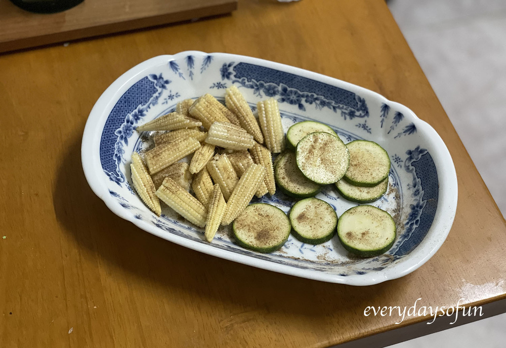 將櫛瓜洗淨切片狀,玉米筍斜切,依自己喜歡的方向調味,我選擇簡單灑上椒鹽。