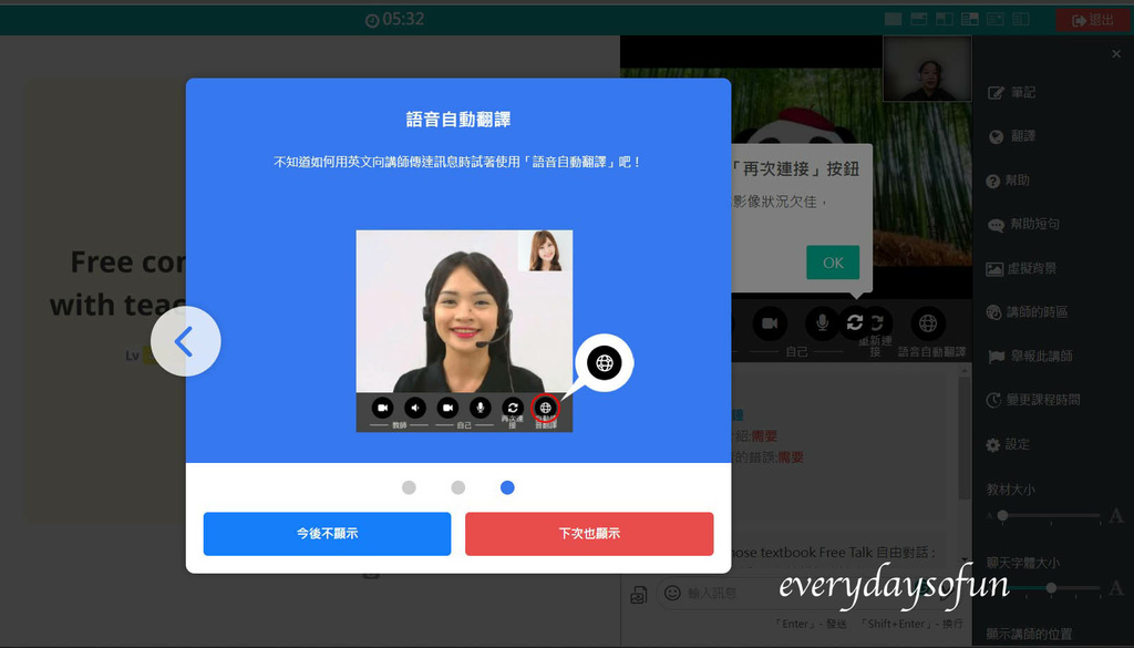 藍色燈號即可立即上課,若有喜歡的講師可使用金幣預約下次上課,每位講師的簡介中都有許多相關資料可以參考,包括講師的風格與影音觀看,可事先了解講師的口音與教學方式。