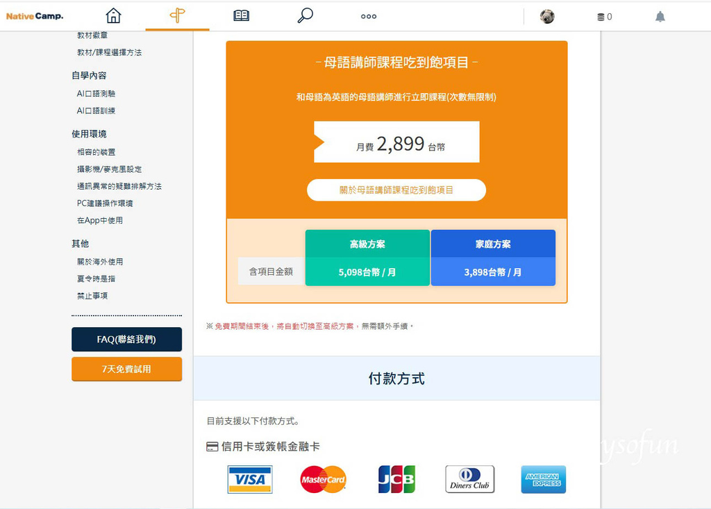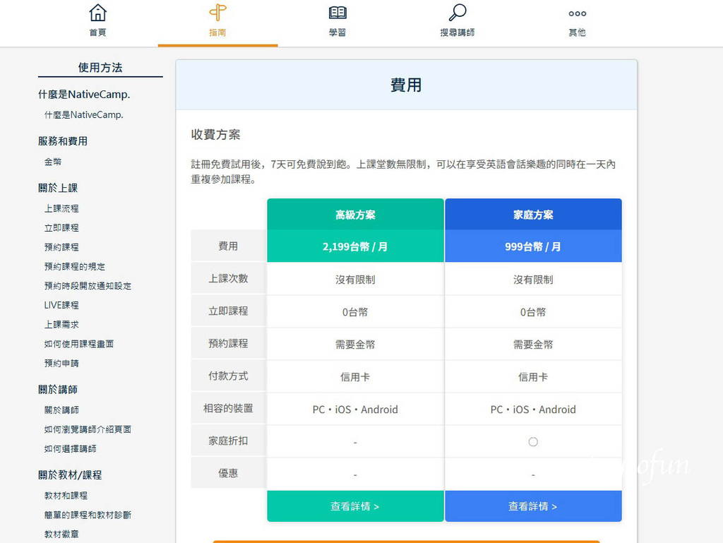 首先再次強調Native Camp.是月費制,每個月固定費用為$2199,不綁約,上課次數無上限,另外還有提供家庭方案,可以參考官網說明。