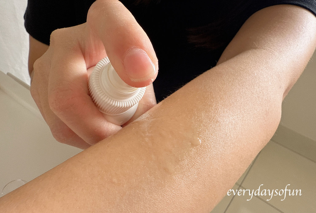 除了手腳之外,其實全身都能使用喔,只要在需要部位的肌膚上噴灑即可,若是要使用於臉部,可以先噴在手上,用輕拍塗抹的方式上臉,不要直接對著臉部噴灑,畢竟小朋友比較難控制,Zia自行噴灑時,就因為沒看清楚噴頭的位置而噴到眼睛,眼睛有異物一定會不舒服,此時千萬不要揉眼睛,只要閉上眼睛一下下,讓眼淚自動分泌流出,就沒事囉~