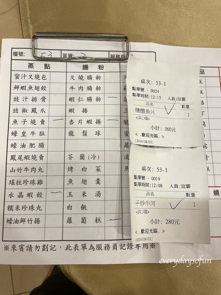 入座會送上一張菜單並詢問想喝什麼茶,大多數的餐點在菜單上都有,另外會有點心推車四處遊走,隨時都能取餐,當然也能等餐車推到你旁邊再取,但有些熱門的點心,在餐期可是一籠難求,看準推車出現的話,其實可以帶著帳單夾直接去取比較快,有想吃的也可以直接找服務人員詢問。
