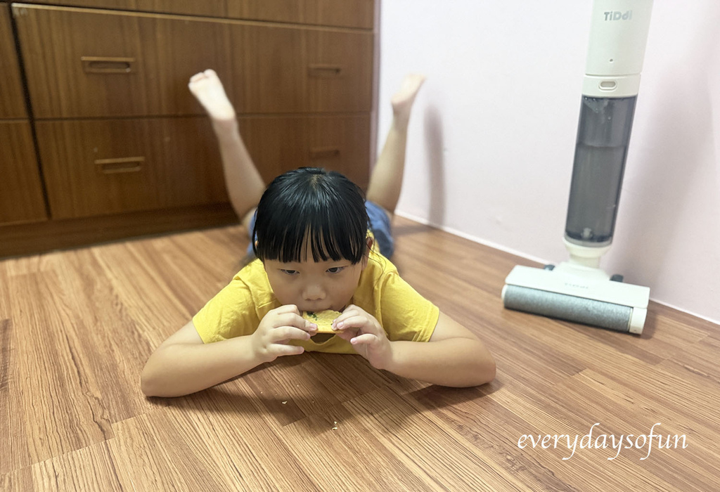 小孩房最可怕的是什麼?就是吃餅乾後的食物碎屑,還有像是寫完作業的橡皮擦屑屑,這些也都能使用小精靈洗地機一次清理,讓小孩趴在地上活動時,家長也能放心不少。