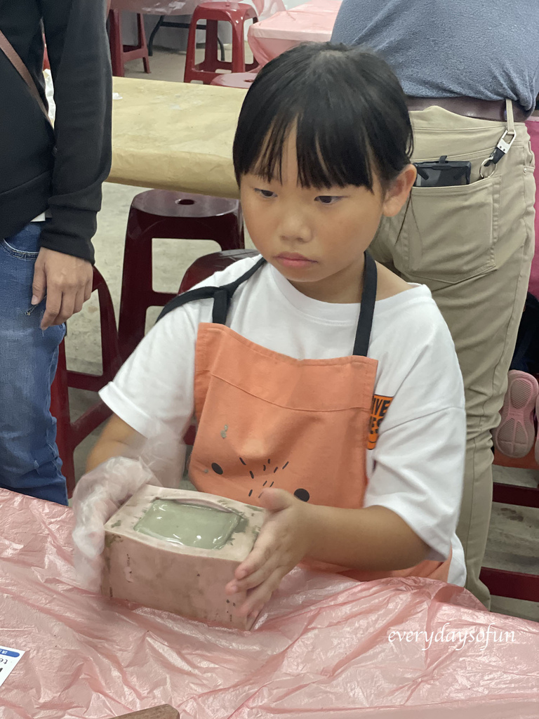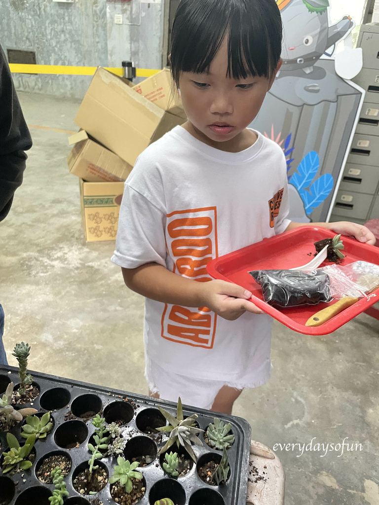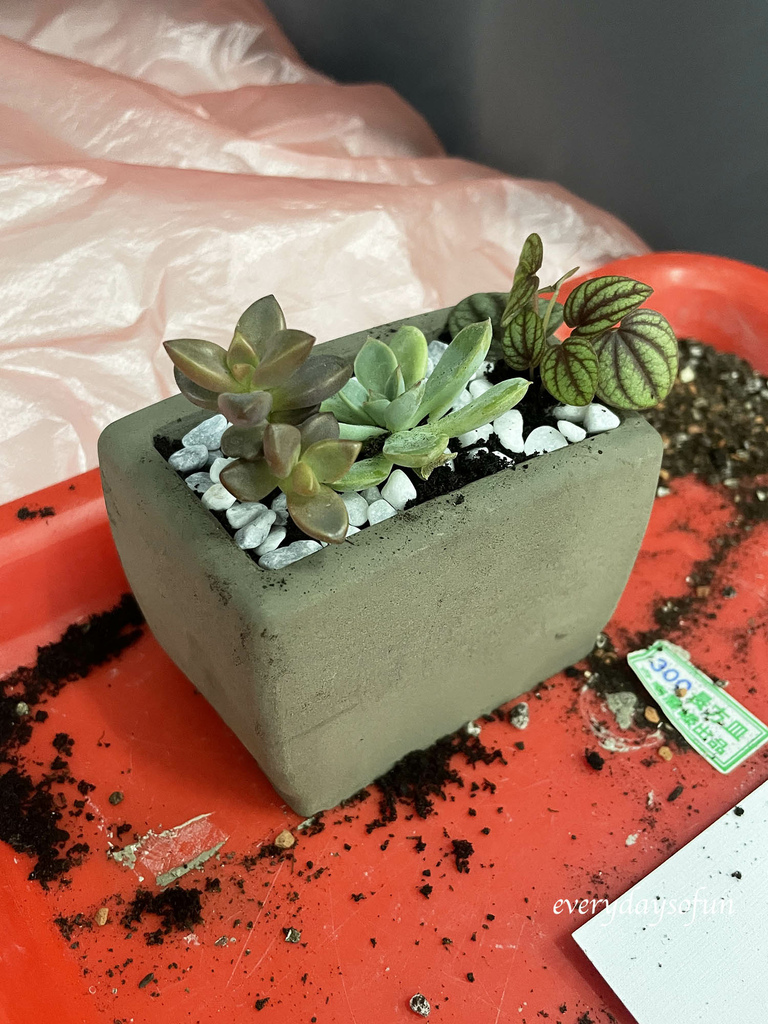 接下來就是大約60-70分鐘的時間要等水泥乾才能脫模,這時間可以到外面玩耍,等時間到了再回來,老師會幫忙確認是否可以脫模,然後讓你選擇三株小小的多肉,放入盆中一起帶回家,當然也會教你該如何種植,喜歡畫畫也可以自己上色喔。