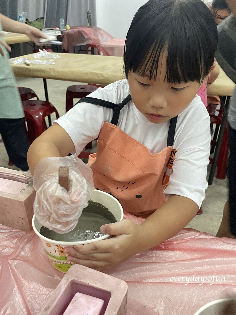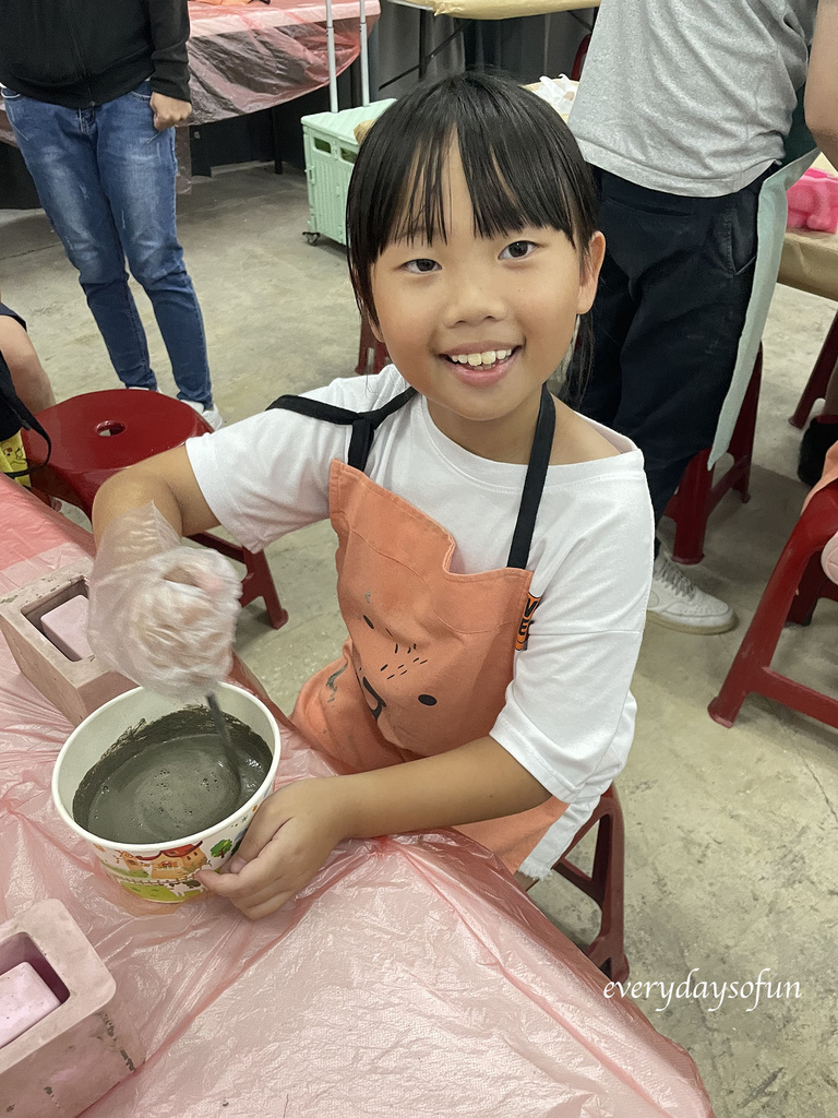 一開始會由專人帶領認識材料,接著進行一步步的攪拌與灌製,其實這跟我在手作滴膠超像的,Zia也說模具跟我的一樣,將水泥按比例攪拌完成後,緩慢倒入模具中,輕敲排氣可以避免氣泡破壞使用與美感。