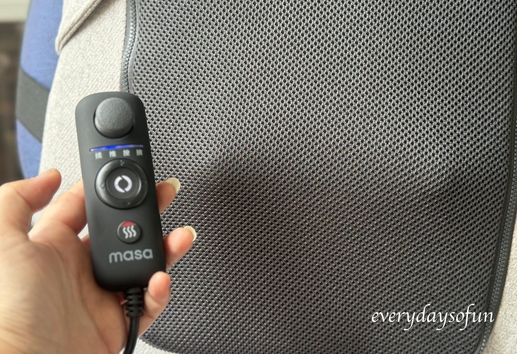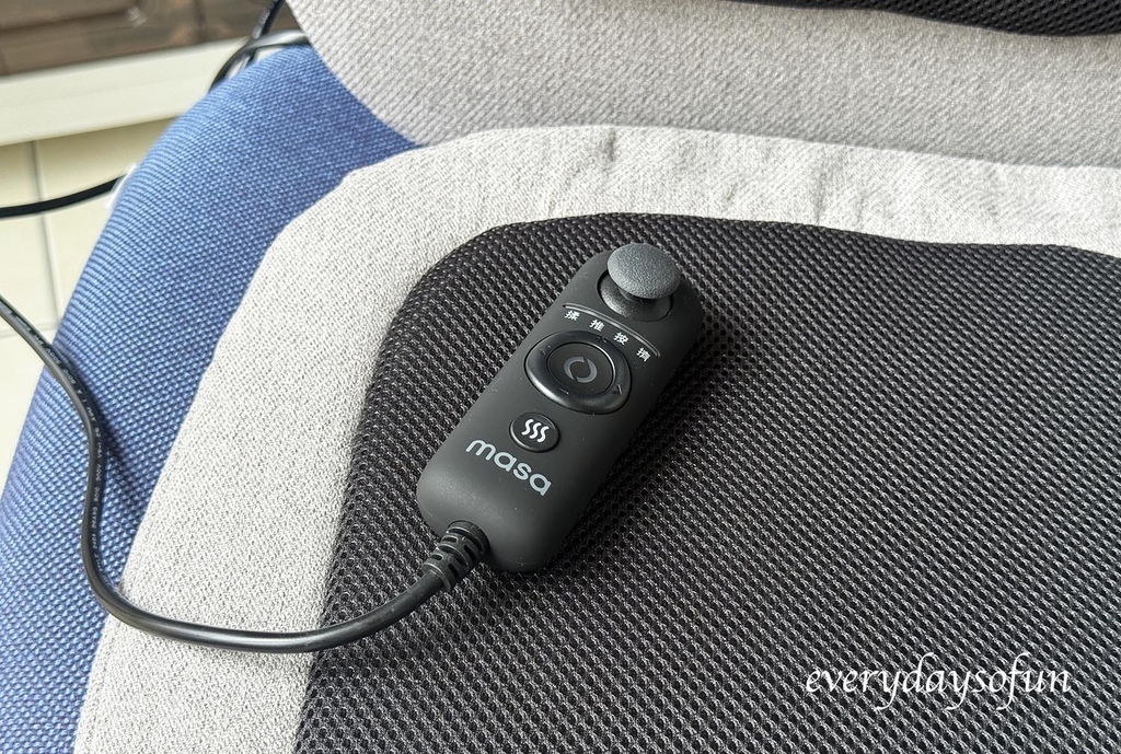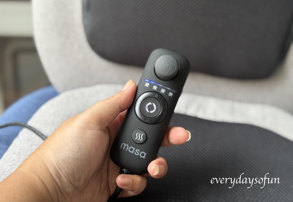 使用椅墊配備的操控器,首先力道能增減,按摩模式也有揉、推、按、擠四種,甚至有搖桿可直接攻克你想要的位置,隨時都可調整,想像一下去外面按摩,要一直動嘴說往上一點、再左邊一些,累不累啊~想按那裡自己最知道!