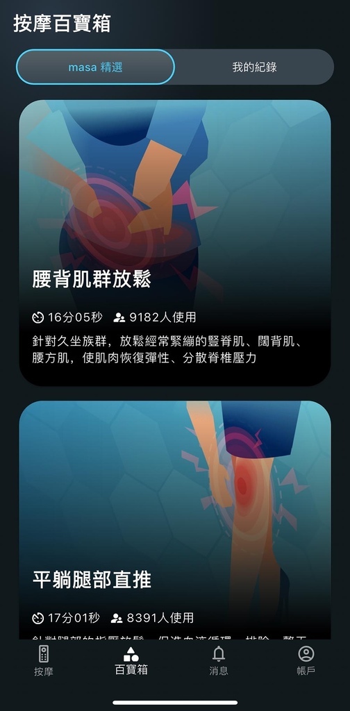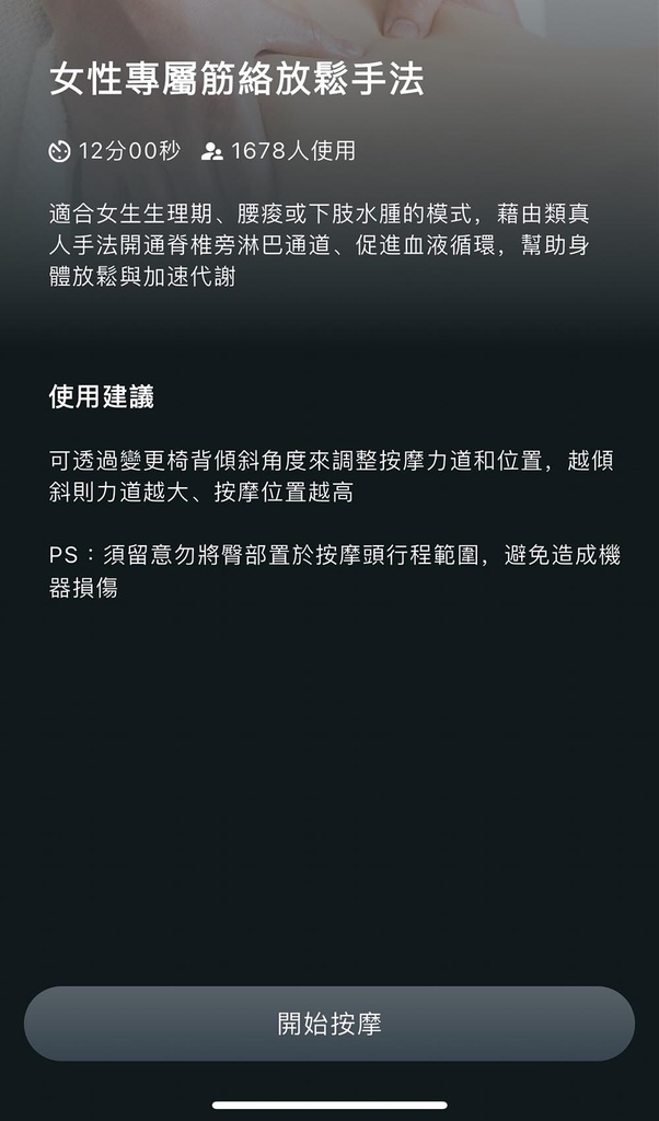 如果不知道該按那些地方,可以使用APP來幫忙,就如同品牌精神一般,APP的操作一樣很直覺簡單,除了能紀錄自己按摩的排程,也能參考其他建議,例如想針對腰背放鬆,或是女性筋絡放鬆等,讓我們連大腦一起放空吧!