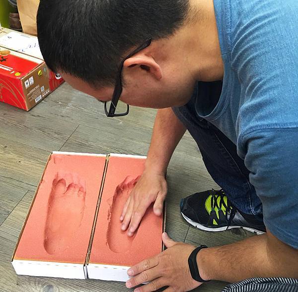 取膜也跟想像中不太一樣,一直以為會是石膏之類的取型體再製作,沒想到居然是圖片這種材質,摸起來粗粗顆粒狀,據店長解說是這種材質能將踩上後回彈的力道一併取進模內,也就是更加有幫助,相對地成本也較高。