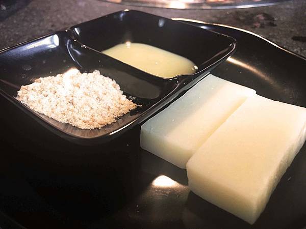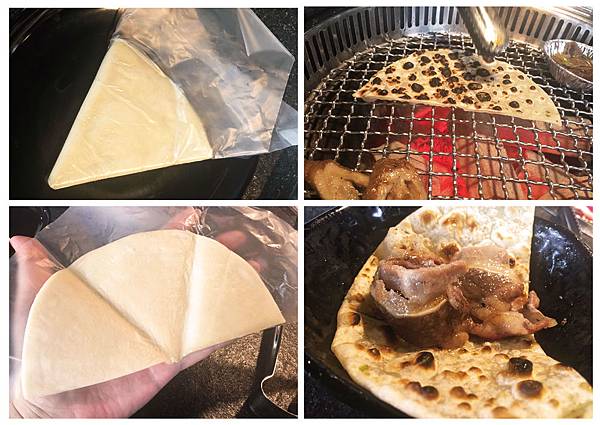 烤肉除了直接吃以外,還能有好多種吃法呢,灑鹽最能吃出肉質鮮甜,沾些沙茶醬則是增添另一種口味,妹子還裹入泡菜吃,超對味呀!這裡除了包肉的生菜以外,還有一個法寶耶燒肉捲皮,妹子一開始以為會是像腐皮一樣的東西,沒想到是一張薄餅,烤的時候絕對要注意,因為它很快就焦啦==