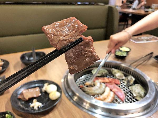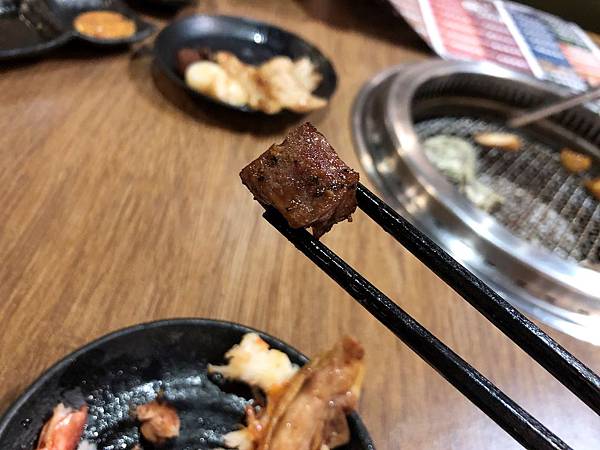 光是牛肉就快要介紹不完了,還有像是骰子牛、牛肋條都十分美味,尤其是骰子牛外焦香內軟嫩的口感,真棒!咱們還有超重要的海味呀,在一入門的海鮮自助區,備有多樣當季新鮮海味,都可以自行取用不浪費。