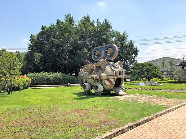 按照規劃動線會先經過一小段沒有遮蔽物的小草坪,左右兩側各有一座大型公仔,一隻巨大的黑豬,還有一隻機械豬XD這隻機械豬是有名子的呢,牠的名子叫做織豬機,至於由來嘛~進廠看動畫就知道囉!